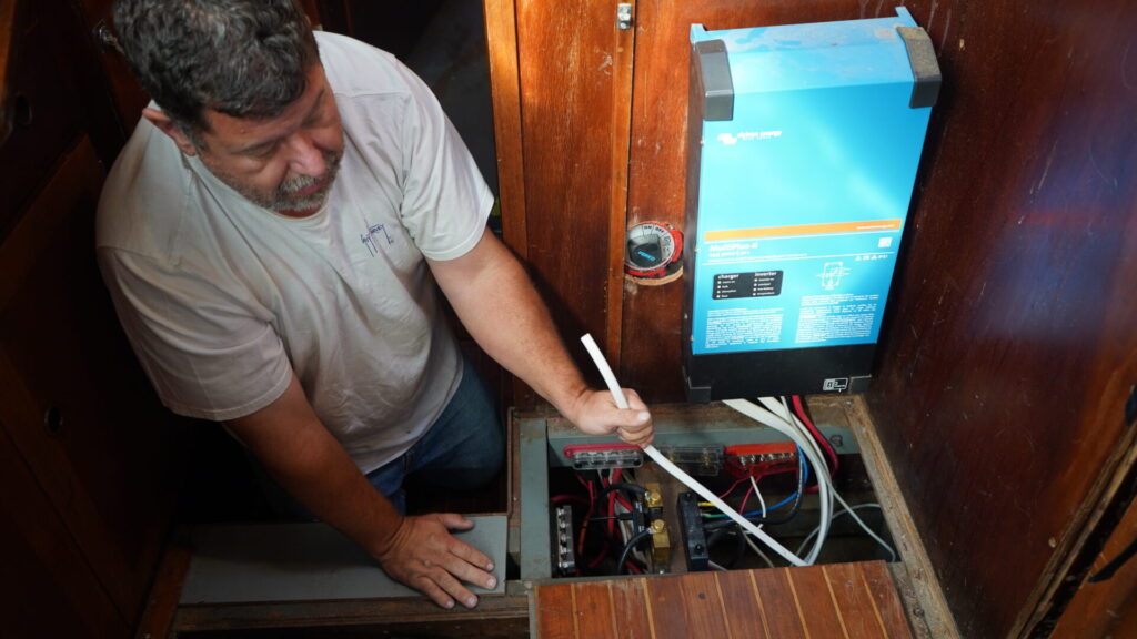 We completed the following projects this month: Removed the old bilge fan from the engine room (ran on 36 volt), added some more electrical outlets to the boat to the settee, captains quarters, fwd cabin and various other places. We also added the fuel fill hose and water fill hose and added new tank sensors for the port side (still have to do for the starboard side) We replaced the holder for the dingy motor, removed the old windlass for inspection so we can get the motor ordered & replaced, Andy started the daunting task of grounding and bonding the boat, added the galvanic isolator. Nancy pressure washed the toe rails (so we can prep to wash and seal with varnish). We start working on the forward bathroom to get the new countertop and sink installed. Nancy completed the pillows and settee cushions. We also prepared our medical kit and ditch bag so we can really get started sailing soon. We also added a new electrical panel for the forward part of boat for a possible 2nd ac unit. How can I forget, we also got the hot water heater installed and the new poop box!!