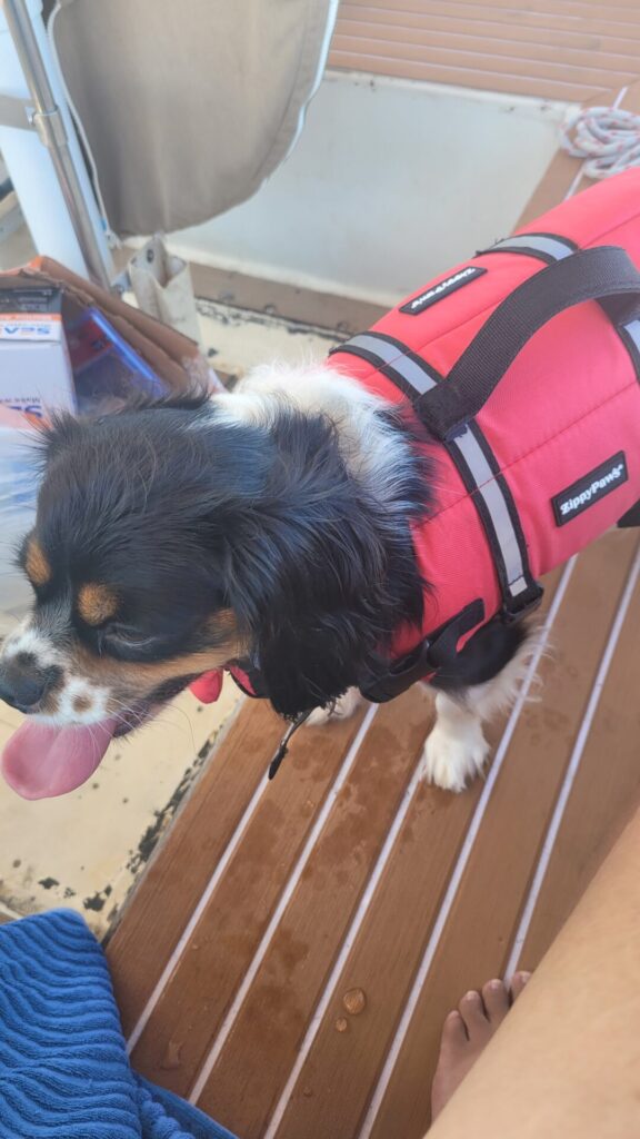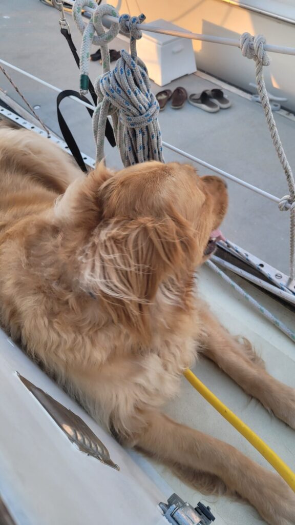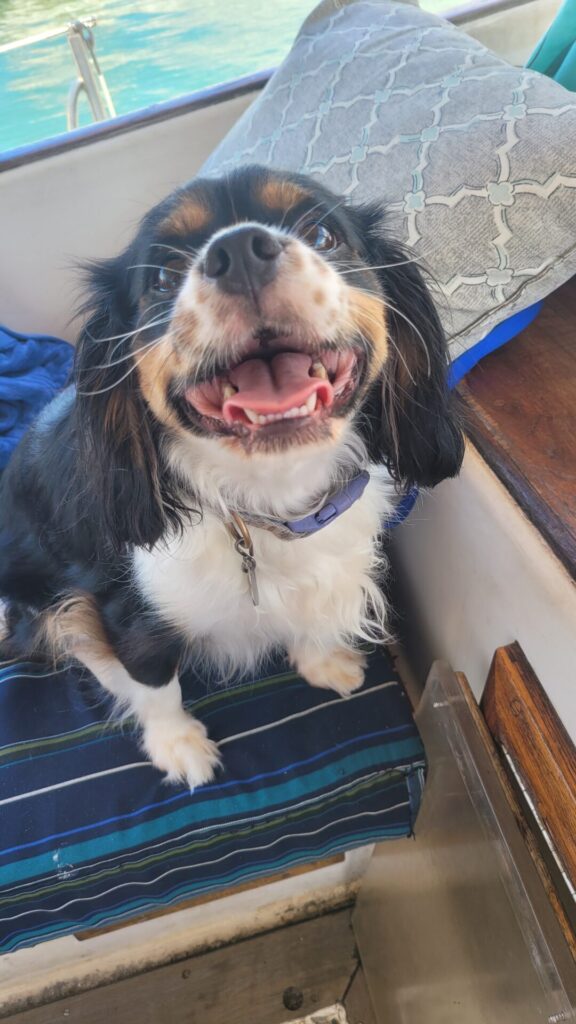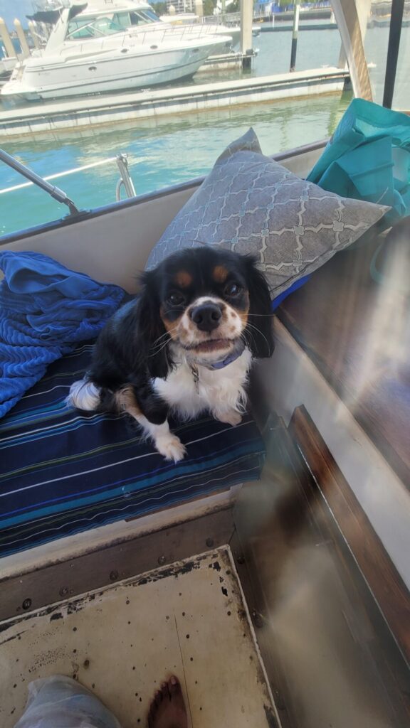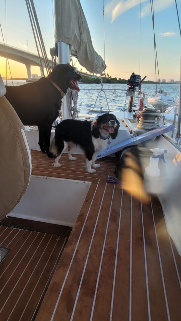 The dogs were slowly introduced to the boat a few times and now they love it and enjoy being at the dock and sleeping on the boat with us.